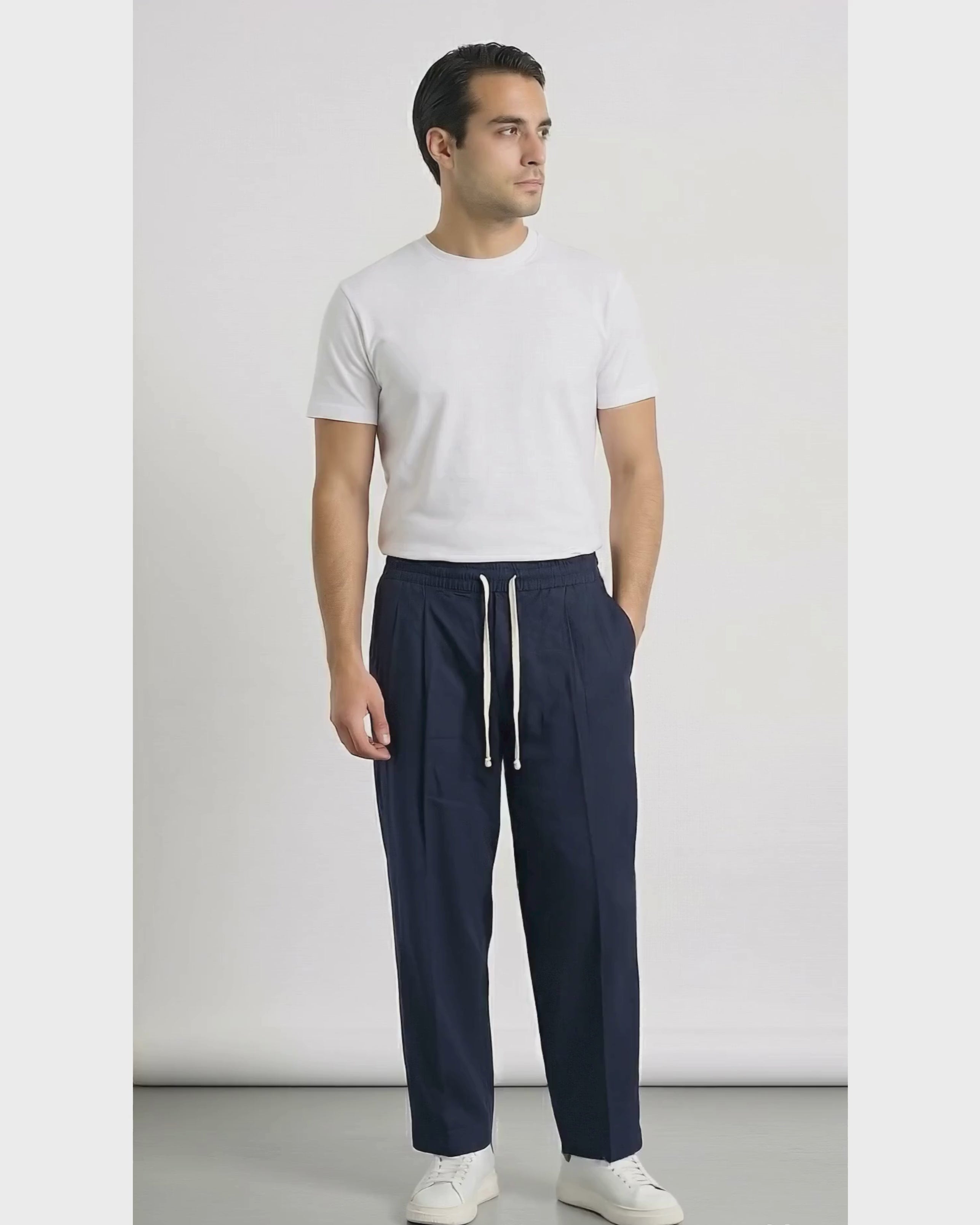 Dettagli: pantalone ampio con pinces frontali • risvolto non cucito • elastico laterale in vita per maggiore comfort • tasca posteriore • lunghezza fino sopra la scarpa